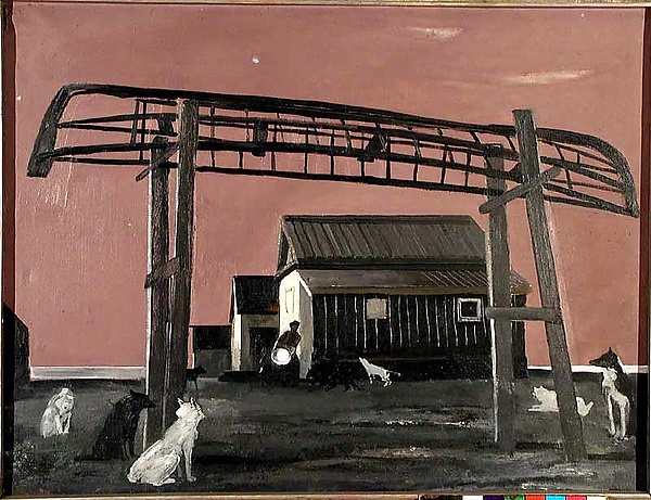 На переднем плане композиции изображены две вертикальные бревенчатые опоры, на верхней части которых расположен остов большой лодки, протянутый по горизонтали холста. У правой опоры находятся две собаки — чёрная сидит, белая лежит; у левой опоры — три собаки, из которых две белые и одна чёрная между ними. На втором плане, за опорами, размещены три небольших дома. У крыльца ближайшего дома стоит женщина с тазом, к которой подбежали четыре чёрные и одна белая собака. Земля и опоры выполнены в тёмно-серой цветовой гамме. Картина отличается вниманием к деталям в изображении животных, что характерно для анималистического жанра.