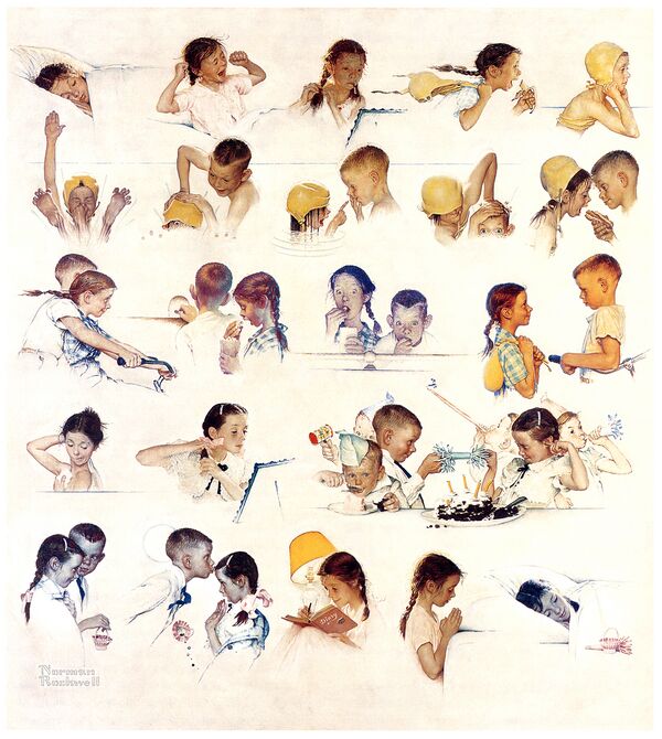 «Когда я позировала для „Одного дня из жизни девочки“, — рассказывала Мэри в изложении Дайаны Денни, — я встала рано, мама причесала мне волосы, сплела косы, и мы пошли [в студию Роквелла]». Первое, что Роквелл сказал им: «Мы собираемся испортить волосы Мэри», и с этими словами он взъерошил её опрятные косы. Первые шесть сцен были завершены за один день. На картине изображён хорошо знакомый сюжет: мальчик встречает девочку, пытается в шутку топить её в бассейне во время купания… Мэри рассказывала, что она и её партнёр на самом деле никогда не позировали в бассейне — позирование для всех сценок проходило в студии. Эффект капающей с влажных волос воды, например, был достигнут с помощью чашки воды. И дети не толкали головы друг друга вниз, как это запечатлено в сценках шуточного утопления. «Мы использовали бронзовый бюст, чтобы опираться… чтобы правильно поднять локоть», — утверждает спустя 60 лет Мэри, а затем добавляет: «Я три или четыре года назад побывала в музее Роквелла, и у них всё ещё был этот бюст в его студии!» Мальчик на картине — Чак Марш (англ. Chuck Marsh), ещё одна модель художника с выразительным лицом. Он был героем более ранней обложки Роквелла «Один день из жизни мальчика»[20], которая была опубликована в том же журнале тремя месяцами раньше[21].