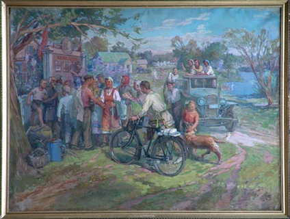 На полотне изображена группа колхозников, собравшихся у Доски Почёта, размещённой слева в композиции. В центре сцены выделяется женщина в красном сарафане и зеленоватом платке, которую поздравляют мужчина в красной майке и женщина в жёлтом платке. Правее располагаются колхозник в белой рубашке навыпуск с велосипедом, мальчик в красной футболке с собакой и ещё одна женщина. На втором плане изображена машина с тремя девушками в кузове. Справа находится голубоватый пруд, окружённый ветлами, а в центре открывается перспектива уходящей вдаль улицы. Освещение рассеянное, вечернее; колорит работы преимущественно тёплый.