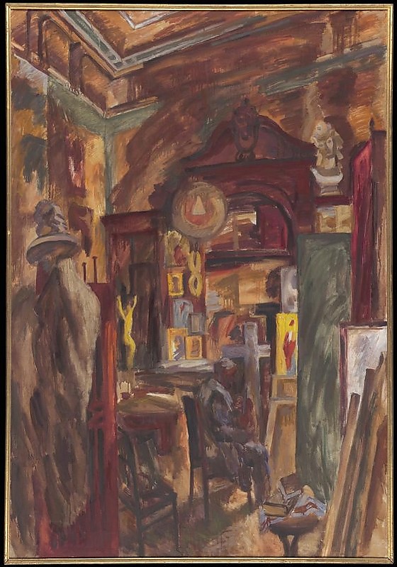 Вертикальная композиция изображает классический интерьер, украшенный лепными элементами и заполненный многочисленными холстами с живописью. В центре полотна находится пожилой мужчина, сидящий на стуле и держащий в руках скрипку. Работа выполнена в жанре портрета.