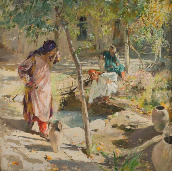 На переднем плане изображена мощёная каменными плитами площадка; в центре перед квадратным водоёмом возвышается ствол высокого дерева. Справа от него размещены две большие керамические вазы, слева — стоящая к зрителю женщина в светло-розовом платье, красных шароварах и лиловой косынке; у её ног находится кувшин. На среднем плане у кромки водоёма присевшая на корточки женщина в белом платье с красной повязкой черпает воду, а за ней — молодая женщина в зелёном платье и оранжевых шароварах, сидящая на бревне и опирающаяся рукой на кувшин. В глубине между зеленью и цветами видны проёмы окна и двери.