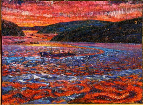 На переднем плане полотна изображена синяя вода с густыми розовыми отблесками, что подчёркивает специфику жанра марина. В центре композиции располагается рыболовное судно, а далее просматриваются высокие берега, слева образующие залив, в котором находятся несколько кораблей. Небо написано в малиново-розовых тонах, а общая цветовая гамма картины выдержана в сине-розовых оттенках. Для придания дополнительной фактурности на холст были наклеены опилки, по которым нанесён красочный слой.
