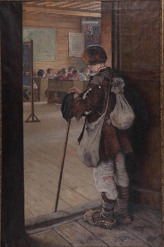 На картине в традициях бытового жанра изображён крестьянский мальчик, стоящий у дверей класса с сумкой за спиной и на боку. Его одежда — ветхий полушубок, холстяные штаны и лапти — подчёркивает принадлежность к крестьянскому сословию. Мальчик стоит спиной к зрителю, опираясь на палку, и внимательно смотрит вглубь комнаты, где за партами сидят дети, а на стене видна классная доска.