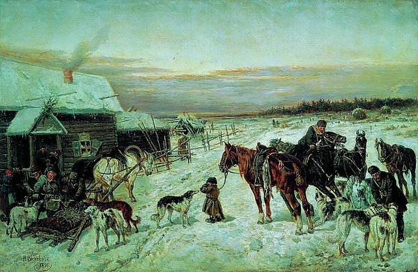 На картине представлена многофигурная композиция (изобразительное искусство), изображающая сцену бытовой жизни на фоне зимнего пейзажа. Слева показана лошадь, запряжённая в сани, к которой выходят мужчины из бревенчатого дома на окраине. Справа находятся двое мужчин: один сидит верхом на лошади, другой стоит рядом с охотничьими собаками. В центре композиции — мальчик, держащий под уздцы лошадь, слева от него расположены три охотничьи собаки. Сцена разворачивается на заснеженном дворе, подчёркивая атмосферу зимнего дня и подготовку к охоте.