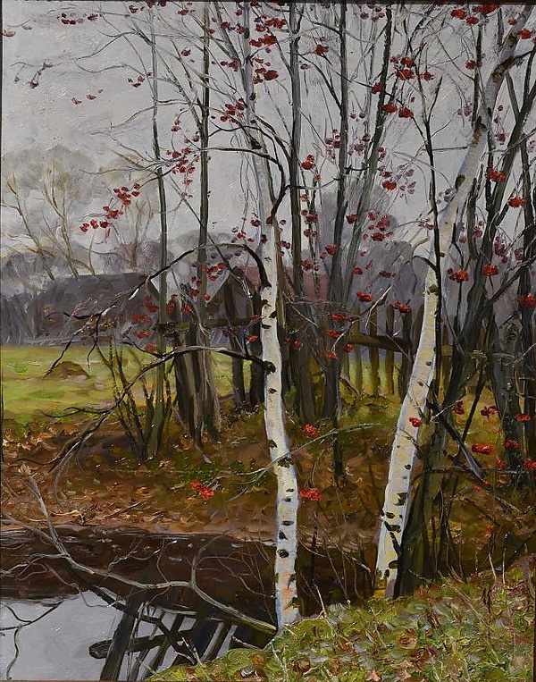 На переднем плане картины изображён небольшой пруд, поверхность которого выполнена в серых и коричневых оттенках, что подчёркивает осеннее настроение осени. Справа на пригорке расположены две берёзы с облетевшими листьями и несколько кустов рябины с ярко-красными ягодами. За деревьями виден слегка покосившийся деревянный забор, отражающийся в воде пруда (отражение). На заднем плане находятся одноэтажные дома в серо-коричневой цветовой гамме, за которыми на фоне голубовато-белого неба просматриваются силуэты деревьев. Композиция передаёт атмосферу осеннего пейзажа.