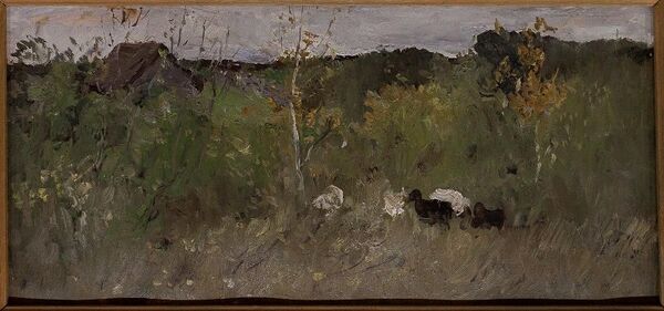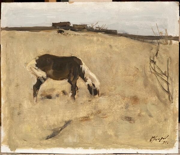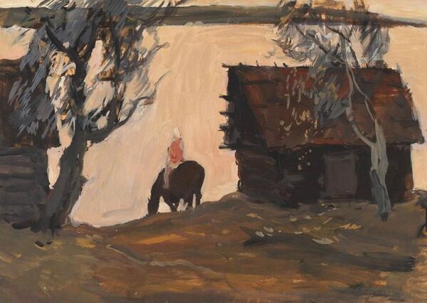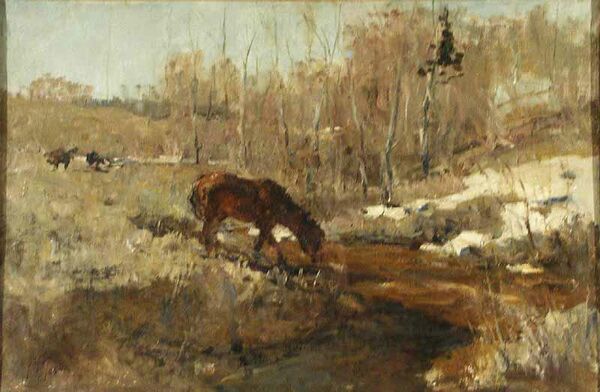 На полотне представлен пейзаж межсезонья: рыжая земля и трава освобождены от снега, местами справа ещё видны снежные участки. В центре композиции изображена рыжая лошадь, пьющая воду из ручья. Слева вверху и справа между деревьями просматривается бирюзовое небо, что придаёт работе особую выразительность цветовой гаммы.