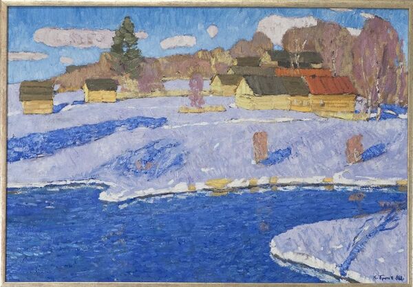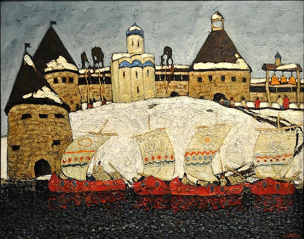 На полотне представлен архитектурный исторический пейзаж в жанре ведуты, выполненный в ракурсе сверху. У берега изображены четыре ладьи, а далее на высоком заснежённом берегу располагается крепость с башнями и белокаменная однокупольная церковь. На площади выделяется звонница с тремя колоколами. Композиция построена с использованием звучного колорита, в котором преобладают тёплые коричневато-красные и холодные голубовато-беловато-серые оттенки.