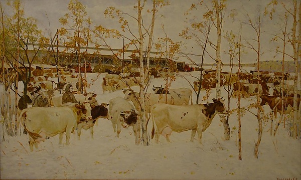 На полотне представлен зимний пейзаж, в котором между стволами берёз на переднем плане изображено стадо белых с коричневыми пятнами коров. Слева находятся фигуры мужчины и женщины, что подчёркивает характерную для пасторали сцену сельской жизни. На втором плане располагается длинное здание фермы, завершающее композицию.