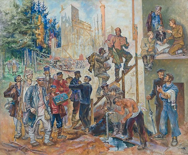 На картине изображена новостройка, возведённая в глубине леса, что подчёркивает сочетание природной среды и элементов индустриального пейзажа. Слева к строительству подходят крестьяне, а справа расположена группа кадровых рабочих. По сходням новоприбывшие поднимаются на подмостки, что создаёт ощущение движения и подчёркивает взаимодействие различных социальных групп в процессе индустриализации. Композиция строится на противопоставлении и объединении участников строительства.