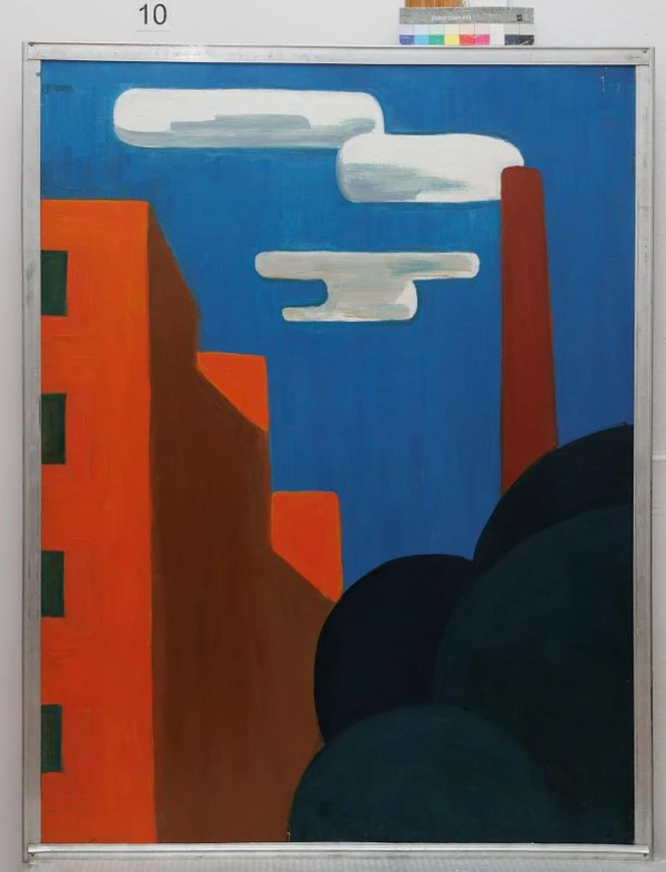 На полотне представлен условный городской пейзаж, в котором слева изображён оранжевый многоэтажный дом. Справа расположены зелёные кроны деревьев в виде сфер и оранжевая труба. Композиция дополнена тремя бело-серыми облаками на фоне синего неба. Работа характеризуется яркой цветовой гаммой и стилизованной композицией.