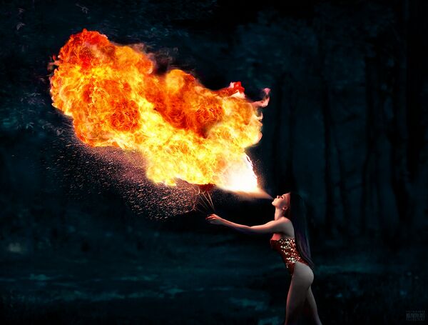 - Выдувание огня — совокупность трюков, заключающихся в выпрыскивании горючего вещества изо рта сквозь пламя факела. В результате в воздухе образуется большой огненный шар. Один из самых опасных для здоровья видов огненных искусств.