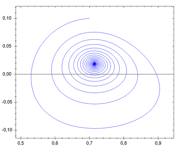 Такая система совершает периодические синусоидальные (гармонические) движения; колебательное движение не возникает лишь в случае и , то есть когда осциллятор в начальный момент находится в состоянии равновесия — в этом случае он продолжает и дальше в нём оставаться. Координатное уравнение фазовой траектории такой системы задаёт интегральные кривые в виде семейства подобных (с постоянным соотношением осей) эллипсов, причём через каждую точку ф.п. проходит один и только один эллипс. Указанное состояние равновесия является особой точкой этой системы, — а именно центром.[3]