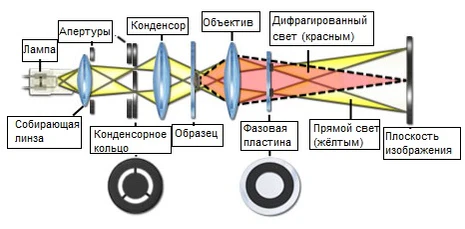 В фазово-контрастном микроскопе падающий на образец волновой фронт разделяется на две волны — плоский волновой фронт (неотклонённый, или фронт нулевого порядка), называемый прямой, или -волной, и дифрагированной -волны. Проходя через образец, обе волны попадают в переднюю линзу объектива, где интерферируют, образуя результирующую -волну. В задней фокальной плоскости объектива формируется дифракционная картина, представляющая собой Фурье-преобразование всех пространственных частот, отклонённых и рассеянных исследуемым образцом при использовании фазово-контрастного метода. Конечное изображение, формируемое в переменной плоскости окуляра, является уже обратным преобразованием Фурье. Сопряжённость этих дифракционных картин служит для усиления контраста получаемого изображения, а наличие фазовой пластины позволяет преобразовывать изменения фазы волны в изменения её интенсивности, наблюдаемые визуально. Схема фазово-контрастного микроскопа показана на рисунке 2.