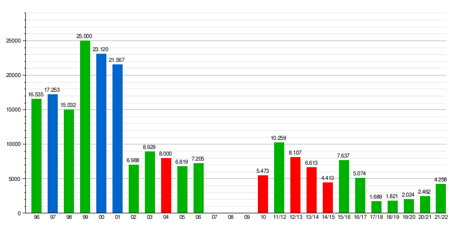 Средняя посещаемость домашних игр «Факела» с 1996 года на профессиональном уровне (сезоны 2007, 2008 и 2009 годов команда на профессиональном уровне пропускала)[36].