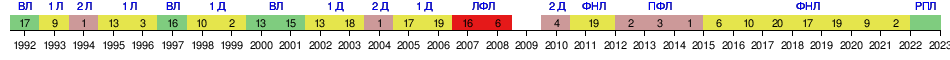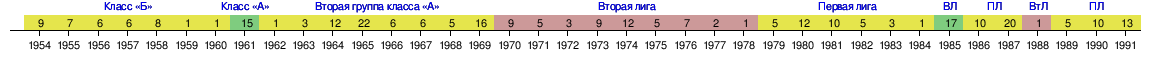 | 1957 | зона 1 | 6 из 18 | 34 | 15 | 9 | 10 | 54-40 | 39 | финал — зона 1 | |||