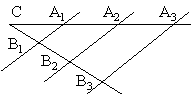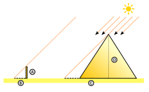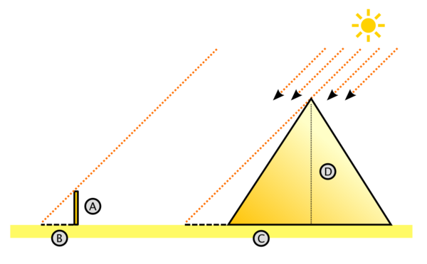Хоть измерение Фалесом пирамид выглядит весьма простым в осуществлении и заключается в решении пропорции , с одним неизвестным D, задача предполагает много математических вопросов. Результатом разбора понятия пропорции, как равенства отношений, подобия сходно расположенных треугольников станет формулировка теоремы Фалеса о пропорциональных отрезках: «Если на одной из двух прямых отложить последовательно несколько отрезков и через их концы провести параллельные прямые, пересекающие вторую прямую, то они отсекут на второй прямой пропорциональные отрезки». Обратная теорема Фалеса звучит как «Если прямые, пересекающие две другие прямые (параллельные или нет), отсекают на обеих из них равные (или пропорциональные) между собой отрезки, начиная от вершины, то такие прямые параллельны»[73].
