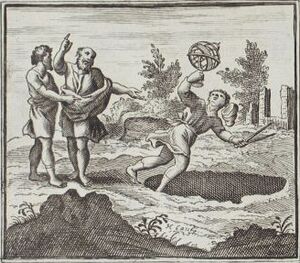С именем Фалеса связаны несколько легенд. Популярность получил сюжет о философе или астрологе, который упал в колодец. Впервые в мировой литературе он приведен в диалоге Платона «Теэтет» первой половины IV века до н. э.[24]: