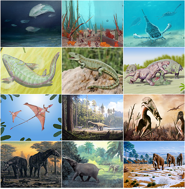 Что касается континентов, то в период раннего палеозоя (538—335 млн лет назад) единственным крупным материком была Гондвана, которая располагалась в районе южного полюса. Соединившись с Лаврентией и Сибирью, она образовала Пангею. В течение мезозоя и кайнозоя Пангея в результате движения плит образовала современные материки. Данный период также ознаменовался многократным изменением уровня мирового океана, многократными похолоданиями, потеплениями или установлениями ровного и тёплого климата, усилением намагниченности полюсов Земли[5]. Фанерозойский эон подразделяется на три геологических эры (от более древних к молодым):