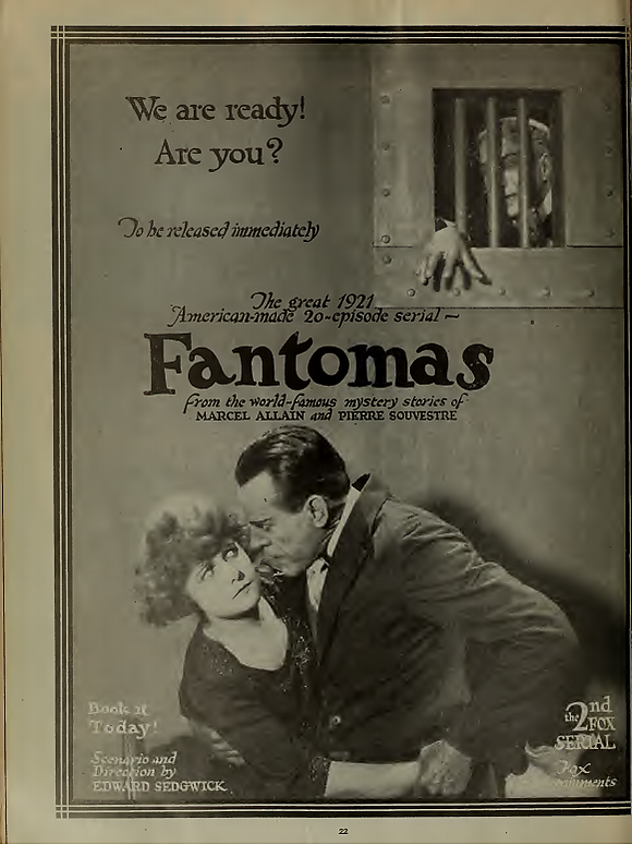 - Фантомас против Фантомаса (по мотивам шестого романа «Le Policier Apache» — «Полицейский-апаш», в любительском одноголосном закадровом переводе «Полицейский-бандит») / фр. Fantômas contre Fantômas (1914).