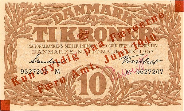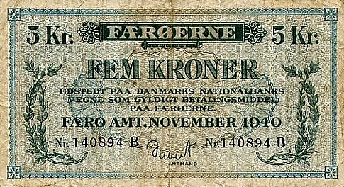 Когда Германия оккупировала Данию 9 апреля 1940 года, датская крона использовалась на Фарерах в качестве валюты. Однако все торговые отношения между Фарерами и Данией были прекращены в результате оккупации, оставив действовать одну валюту на двух независимых друг от друга рынках. 31 мая 1940 были введены специальные фарерские банкноты. Они представляли собой датские банкноты со специальным штампом. Эти банкноты заменили датские 1 к 1.[1]