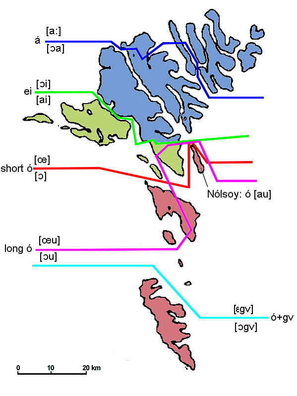 Литературный язык строится на основе говора столицы — г. Торсхавн. Устная форма литературного языка отражает влияние местных диалектов. Выделяют южные диалекты (к которым относится южная часть острова Стрейми, где и расположен Торсхавн) и северные диалекты (диалекты северной части острова Стрейми; островов Хестур, Сури и Санди)[6].