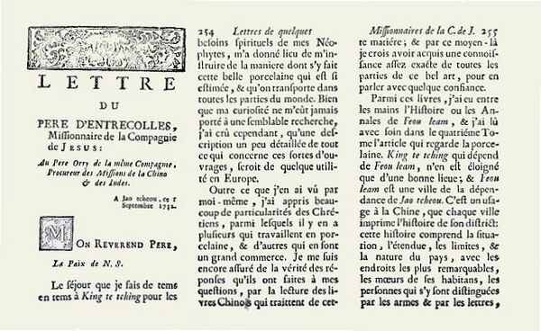 Однако настоящий фарфор ещё предстояло открыть. Химии как науки в её современном понимании ещё не существовало. Ни в Китае или Японии, ни в Европе сырьё для производства керамики ещё не могли определить с точки зрения химического состава. То же касалось использовавшейся технологии. Процесс производства фарфора тщательно задокументирован в записках о путешествиях миссионеров и купцов, но из этих отчётов не могли быть выведены использовавшиеся технологические процессы. Известны, например, записки священника-иезуита Франсуа Ксавье д’Антреколя, содержащие секрет технологии производства китайского фарфора, сделанные им в 1712 году, но ставшие известными широкой общественности только в 1735 году.