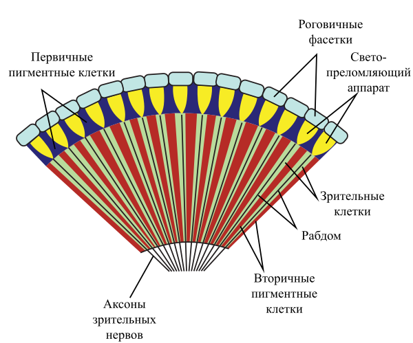 Фасеточные глаза состоят из особых структурных единиц — омматидиев, имеющих вид узких, сильно вытянутых конусов, сходящихся своими вершинами в глубине глаза, а своими основаниями образующих его сетчатую поверхность.