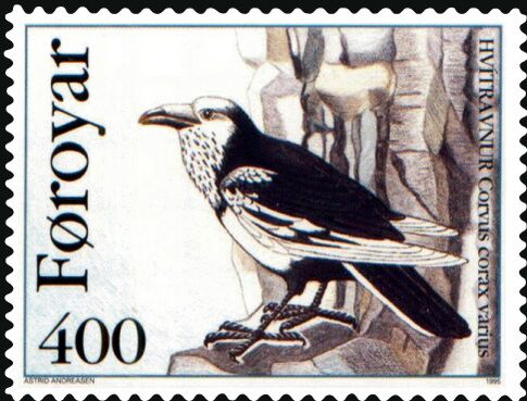 Вплоть до XIX века обычным видом на островах был Фарерский бело-пегий ворон — специфическая местная цветовая вариация исландского пегого ворона (Л. Б. Бёме). Эта цветовая вариация была эндемична для Фарерских островов, и, возможно, из-за этого, со стороны иностранных коллекционеров был большой спрос на этих воронов. Возможно, именно это стало причиной их вымирания. Последний Фарерский бело-пегий ворон был замечен на острове Нёлсой в 1949 году. Сохранилось 15 чучел этой птицы в различных музеях мира (6 в Копенгагене, 4 в Нью-Йорке, 2 в Уппсала, 1 в Лейдене, 1 в Брауншвейге и 1 в Дрездене). 12 июня 1995 года были выпущены марки, изображающие этого ворона (художник — Астрид Андризен)[1].