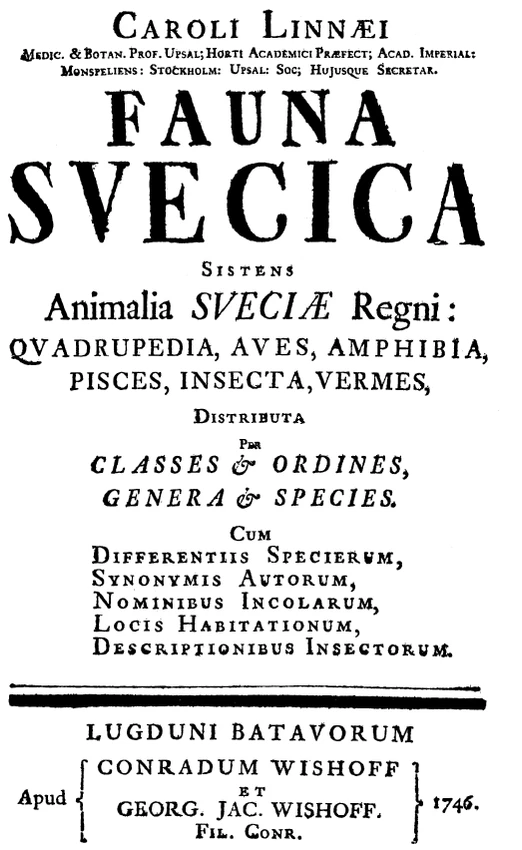 | Название | лат. Fauna svecica : sistens animalia sveciae regni: mammalia, aves, amphibia, pisces, insecta, vermes, distributa per classes & ordines, genera & species, cum differentiis specierum, synonymis auctorum, nominibus incolarum, locis natalium, descriptionibus insectorum |