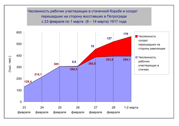 Всего в России за январь-февраль 1917 года только на предприятиях, подчинённых надзору фабричной инспекции, бастовало 676 тыс. человек, из них участников политических стачек в январе было 60 %, а в феврале — 95 %[35].