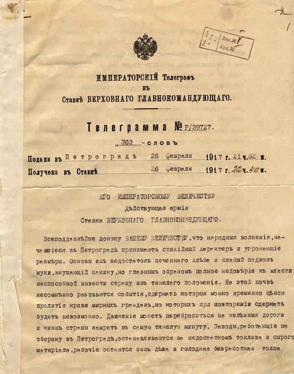 Николай II узнал о начале революции около 1800 из двух параллельных источников — одно донесение поступило от Хабалова через начальника штаба Верховного главнокомандующего генерала М. В. Алексеева, второе пришло от министра внутренних дел А. Д. Протопопова через дворцового коменданта В. Н. Воейкова. Ознакомившись с обоими донесениями, царь потребовал телеграммой от Хабалова решительного прекращения беспорядков в столице. Ночью сотрудники охранного отделения произвели массовые аресты[2][36].