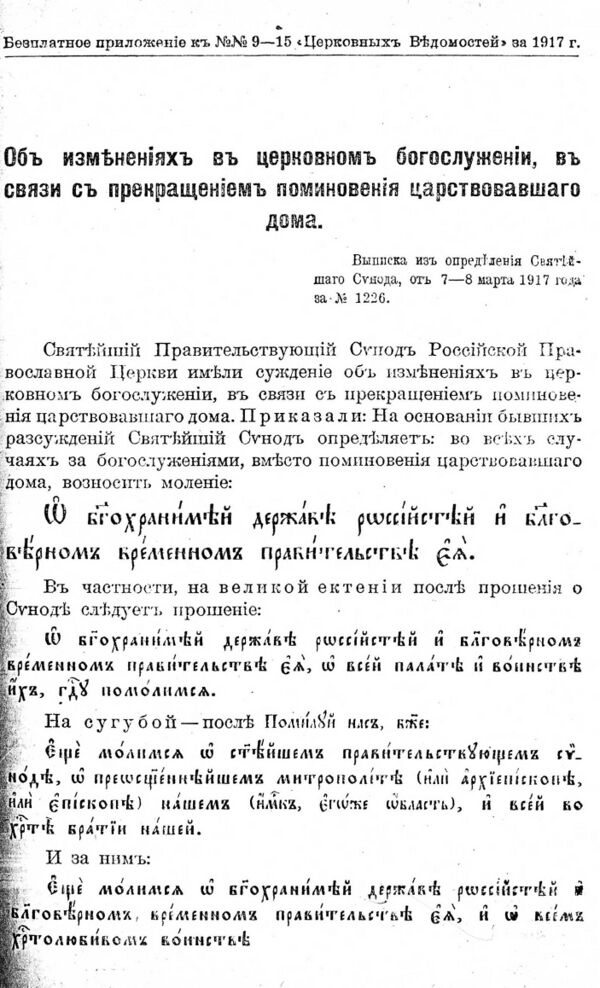 7 марта Синод начал именовать дом Романовых «царствовавшим» (в прошедшем времени), упразднив также «царские дни» (празднования дней рождения и тезоименитств царя, царицы, наследника, дней восшествия на престол и коронования). Соответствующее постановление Временного правительства появилось только 16 марта.