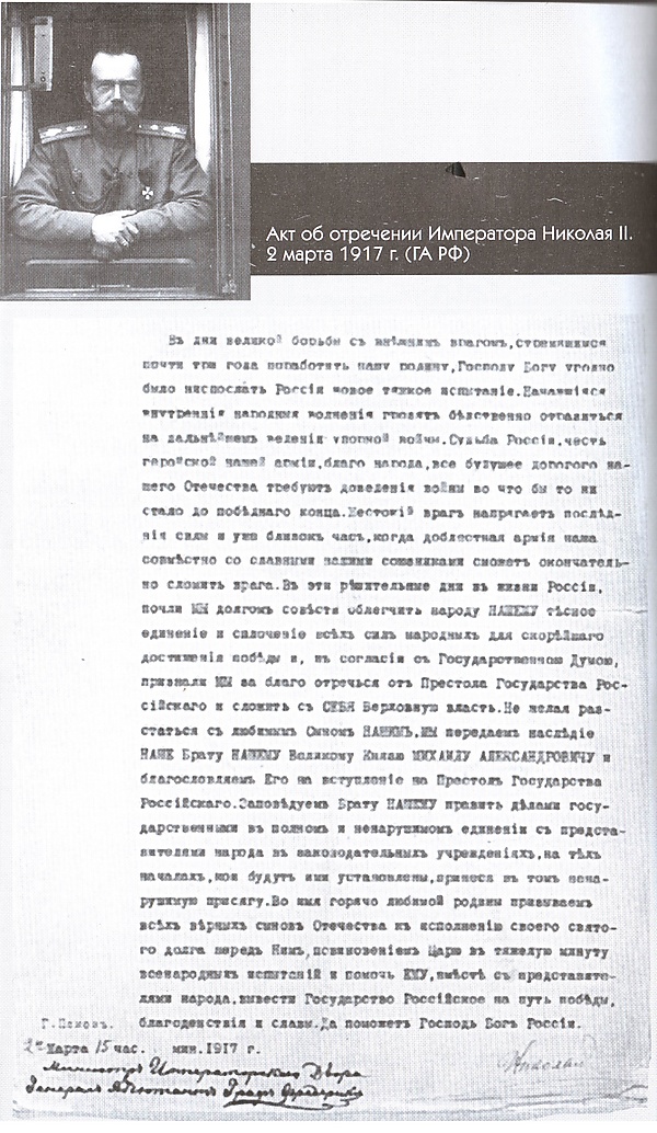 Другим существенным изъяном в законности новой власти стало само отречение Николая II. Считалось, что согласно действовавшему на тот момент манифесту о престолонаследии Павла I, царь не имел права отрекаться за иное лицо, в данном случае — за наследника[94]. Ряд великих князей и думских лидеров сразу обратили внимание на это противоречие. Милюков в своих мемуарах даже предположил, что решение царя отречься за наследника было осознанной «провокацией» Николая II, с тем, чтобы, когда революция пойдёт на спад, как в 1907 году, отказаться от собственного отречения. Ричард Пайпс предлагает более прозаическое объяснение: Николай II как носитель традиционного «вотчинного духа» считал себя стоящим выше любых законов. Единственным мотивом его решения отречься за наследника было желание оставить своего тяжело больного сына в семье; в случае своего предполагаемого воцарения наследнику пришлось бы исполнять определённые государственные обязанности, и остаться в семье он бы не смог.