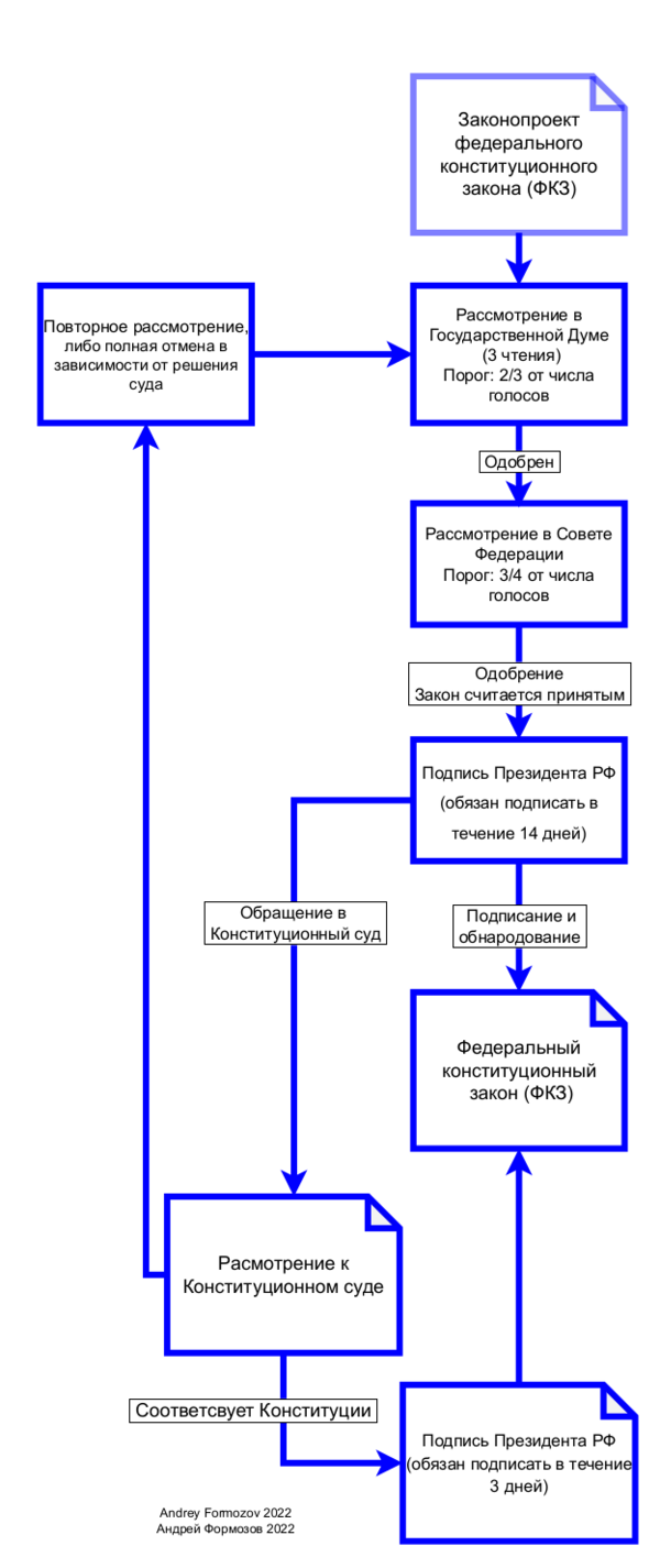 При этом по одному вопросу может приниматься несколько ФКЗ, по нескольким вопросам — один ФКЗ. В настоящее время не принят ФКЗ, определяющий порядок созыва Конституционного собрания и ФКЗ, определяющий изменение конституционно-правового статуса субъекта Российской Федерации.