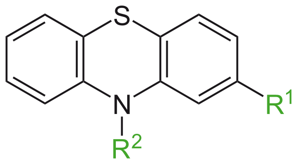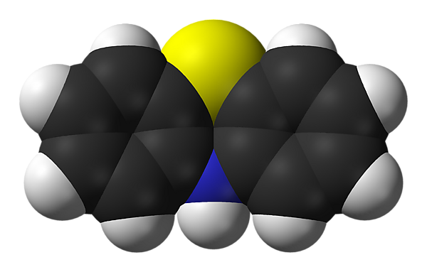 Фенотиази́н — гетероциклическое соединение, содержащее в цикле атомы серы и азота (другие названия — тиодифениламин, дибензотиазин, парадибензотиазин, 10H-дибензо-[b, e]-1,4-тиазин). Брутто-формула — С12Н9NS. Является сернистым аналогом феноксазина. Производные фенотиазина — лекарственные средства, обладающие холиноблокирующими (диэтазин), нейролептическим (аминазин[8]), антигистаминным (дипразин[9]) или антиаритмическим (этмозин[10]) действием, а также красители.