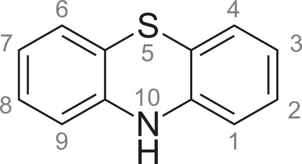 Согласно номенклатуре ИЮПАК, фенотиазины нумеруются против часовой стрелки, начиная с атома углерода, следующего за атомом азота[11]: