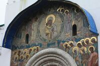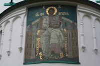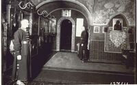 - отдельный вход для императорской семьи в пещерный храм. Вход был украшен иконой (не мозаичным панно) с изображением преподобного Серафима Саровского.