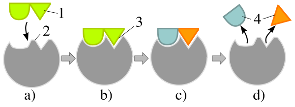 Ферменты снижают энергию активации реакций, ускоряя их протекание. Они связываются с субстратом, образуя фермент-субстратный комплекс, после чего происходит превращение субстрата в продукт и освобождение продукта из активного центра.