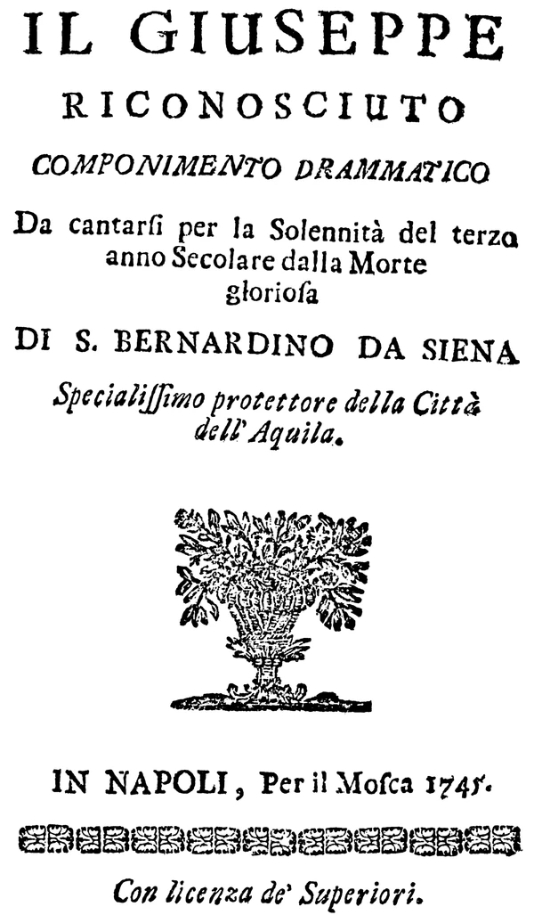 - Giuseppe riconosciuto (оратория, либретто Метастазио, 1745, Неаполь)
