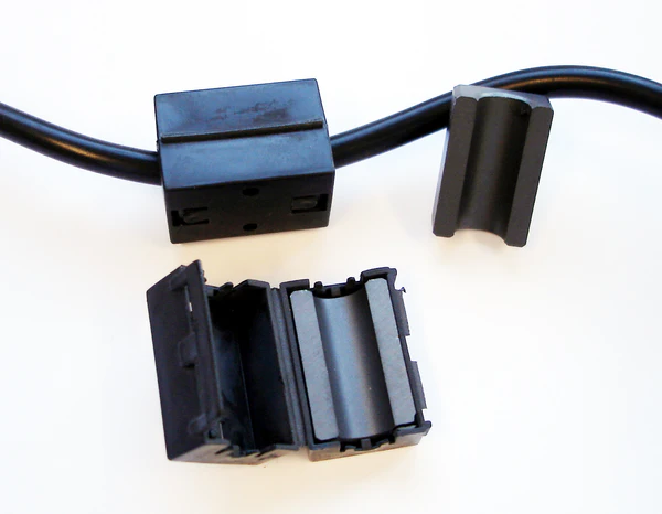 - Фильтр, установленный на многожильный кабель, такой как кабель передачи данных, шнур питания, или интерфейс: USB, видео, и др. В таком случае феррит создаёт на данном участке кабеля синфазный трансформатор, который, пропуская противофазные сигналы (несущие полезную информацию), отражает (не пропускает) синфазные помехи. В этом случае не следует использовать поглощающий феррит во избежание нарушения передачи данных, и желательно применение более высокочастотных ферроматериалов.