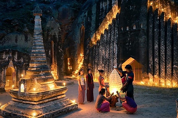 На фестивале Тазаундайн мьянманцы запускают горящие воздушные шары и разноцветные бумажные фонарики всевозможных форм и размеров в честь дня, когда Будда вернулся на землю после встречи с духом своей матери на небесах. По традиции огни в небе должны освещать ему обратный путь [2].