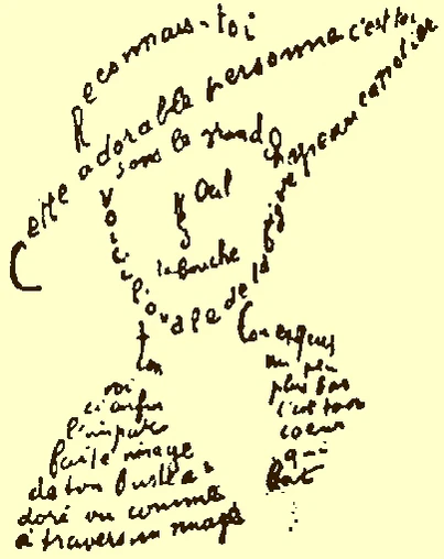 Каллиграммы Аполлинера, как правило, представляют собой коллажи из рукописных фрагментов, не поддающихся прочтению ввиду неразборчивости почерка, что служит ещё одним подтверждением того факта, что в художественной речи номинативная функция зачастую становится вторичной по отношению к функции изобразительной.
