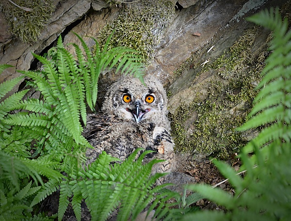 Птенцы вылупляются в том же порядке, что и были отложены яйца, но неравномерно: иногда два птенца появляются на свет почти одновременно, а иногда с интервалом в несколько дней. Вследствие этого в одном гнезде можно обнаружить несколько птенцов, сильно отличающихся друг от друга размерами и общим развитием. Только что появившиеся на свет совята весят около 60 г[109]. Они незрячие и беспомощные, покрыты густым беловато-охристым пухом[110]. В возрасте 4 дней открываются глаза[29], в возрасте около 20 дней первоначальный почти монотонный пуховой наряд сменяется более пёстрым нарядом из мелких пуховидных перьев (известных как мезоптиль), в котором белый фон перемежается множеством бурых пятен и полосок[7][111][110]. Примерно в это же время сильно выросшие и окрепшие птенцы способны целиком проглотить небольшую добычу. За всё время кормления наличие гнезда выдают громкие и хриплые звуки «чииб», издаваемые птенцами по нескольку раз за минуту. При приближении к гнезду родителей этот сигнал присутствия сменяется на более быстрое щебетание «ука…ука…ука», символизирующее степень голода[110]. Младшие часто не выдерживают конкуренции со старшими за доступ к еде и умирают от голода, либо становятся жертвой каннибализма[112]. Орнитологи подчёркивают, что редкий среди сов каинизм в целом является характерной чертой для филинов. Взрослая самка первые три недели почти не покидает потомство, занимаясь разделыванием принесённой самцом добычи, кормлением и охраной птенцов, а после помогает самцу в добывании корма[113].