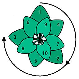- Правило чередования кругов: листья новой мутовки закладываются точно в промежутках между листьями уже заложившейся мутовки.