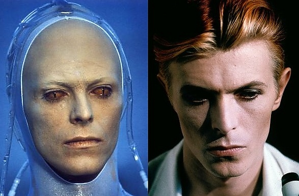 Одной из первых работ Боуи в кино стала главная роль в фильме «Человек, который упал на Землю» где музыкант изобразил пришельца, корабль которого разбился на Земле. Инопланетянин принимает человеческий облик, берёт себе имя Томас Джером Ньютон и пытается постичь человеческую сущность. По мнению обозревателя журнала «Мир Фантастики», за счёт необычной внешности и природного артистизма «у Боуи было всё необходимое, чтобы играть самые необычные роли в фантастике»[76]. Это перевоплощение считается одной из лучших ролей музыканта[70][72][73]. Как следствие, он стал лауреатом премии «Сатурн». Публицисты отмечали, что артист «великолепно вжился в образ инопланетного существа: неземной взгляд, бледное лицо, худоба, странная пластика движений»[1]. Фильм получил ярлык «культовой классики», с помощью которой будущим поколениям будут «объяснять наследите артиста»[70]. Критики отмечали влияние Боуи на субкультуру готики[1][76][7] благодаря участию в фильме «Голод» где он сыграл вампира. Сегодня этот фильм называют «„Сумерками“ для взрослых»: стильный, красивый, с массой метафор[1], а роль Боуи — одной из самых трагических в его карьере[73].