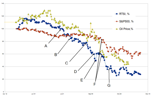 Война в Грузии для многих стала последней каплей. Страх перед капризным и своенравным поведением Кремля привел к массовому бегству инвесторов из страны; по оценке экспертов, в первые несколько недель после начала боевых действий из России ушло инвестиций на сумму в двадцать один миллиард долларов. Дополнительными негативными факторами стала общая нестабильность мировых фондовых рынков и падение цен на нефть, от которых зависит финансовое благополучие России. 16 сентября Алексей Кудрин заявил, что в случае, если нефть будет стоить менее 70 долларов за баррель, федеральный бюджет придет к дефицитному балансу. <…> Вектор падения, наметившийся на рынках в результате бегства инвесторов, стал особенно резким после того, как внутренние инвесторы стали сталкиваться с маржевыми требованиями по акциям, купленным на заемные средства.