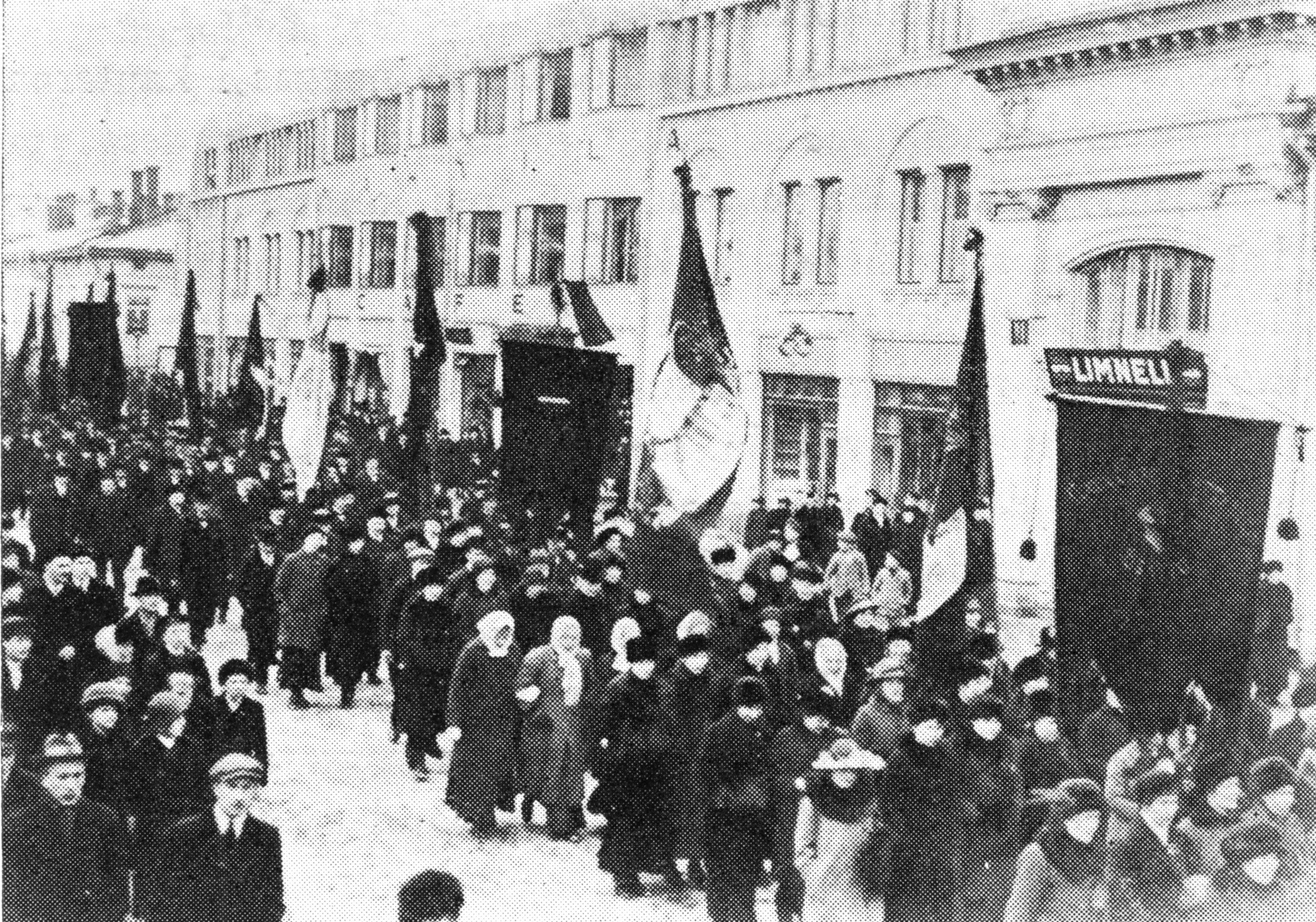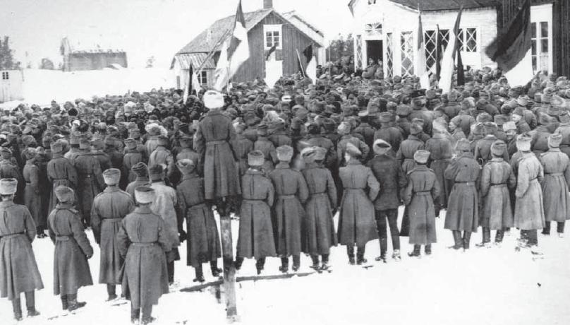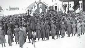 В декабре 1917 — январе 1918 годов обострилась борьба «красных», поддерживаемых Российской Советской Республикой, и шюцкором («охранными отрядами») — самодеятельной боевой организацией, впервые возникшей в революцию 1905 года («Союз силы»), запрещённой в 1909 году правительством России и возродившейся в 1917 году на прежних принципах, но под новым именем. Это противостояние переросло в революцию и гражданскую войну. В ходе революции «красными» было провозглашено Революционное правительство Финляндии[36], принявшее название Совет народных уполномоченных Финляндии, который поддержала Российская Советская Республика. Совет народных уполномоченных Финляндии контролировал южную территорию республики. Остальная территория была под контролем прежнего Финляндского сената. Эту сторону называют «белой» («белофиннами»). Костяк будущей её армии составили представители шюцкора. Белые были поддержаны кайзеровской Германией, которая направила в Финляндию свои войска (после окончания гражданской войны они были оставлены в Финляндии). Решающий перелом в Финляндской гражданской войне произошёл 3 апреля 1918 года, когда под Хельсинки высадился германский экспедиционный корпус под командованием генерала Рюдигера фон дер Гольца[37].
