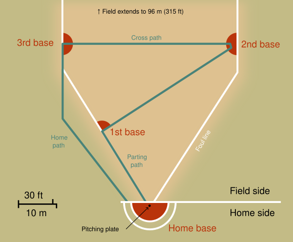 - Движение по базам идёт зигзагом, с третьей на домашнюю базу бегущие движутся за пределами поля.