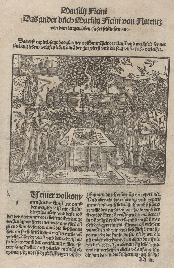В одном из написанных в 1470-х годах писем к Джованни Кавальканти Фичино подробно анализирует болезненное для него эмоциональное состояние упадка сил и безразличия. Избавиться от приступа меланхолии философу помогало только музицирование, но важность проблемы требовала теоретического осмысления. В качестве общего решения Фичино рассматривает две возможности: признать, что меланхолия исходит не от Сатурна, либо, следуя Аристотелю, признать её высшим даром. В написанном спустя несколько лет трактате «О стяжании жизни с небес» Фичино избирает второй путь. Чёрная жёлчь меланхолии, по его мнению, благодаря своей проницающей способности способствует проницательности мысли; она же и возвышает, так как соответствует высшей из планет. Все studiosi предрасположены к меланхолии если не в силу гороскопа, то по роду своих занятий[187]. В трактате рассматриваются способы борьбы с меланхолией у учёных, возникающей вследствие того, что лица умственного труда находятся под покровительством Сатурна, отвечающего также за меланхолический темперамент. В качестве рекомендации Фичино даёт учёным совет избегать связанных с Сатурном предметов и, напротив, окружать себя растениями, животными и минералами, принадлежащими более жизнерадостным Солнцу, Юпитеру и Венере. Наиболее благотворны насыщенное духом Солнца и Юпитера золото и золотистые цветы крокуса[188]. Полезны также диета и правильный образ жизни: вино, ароматная еда, благовония, чистый воздух и занятия музыкой. Из всех средств против меланхолии, музыку Фичино считал наиболее действенной благодаря сродству среды, в которой она распространяется — воздуху — с человеческим духом. Таким образом, в иерархии чувственных восприятий Фичино слух ставит выше вкуса, обоняния и осязания. Преимущество слуха также вытекало из его возможности восприятия движения, в том числе и перед зрением, которое, как считалось, поставляет в мозг только серии статичных изображений[189]. Благотворное влияние Сатурна не ограничивалось противостоянием меланхолии — его пронизывающие весь космос лучи, обладающие оптимальным соотношением теплоты и влажности, способствуют пищеварительной, выделительной и репродуктивной способностям организма[190].