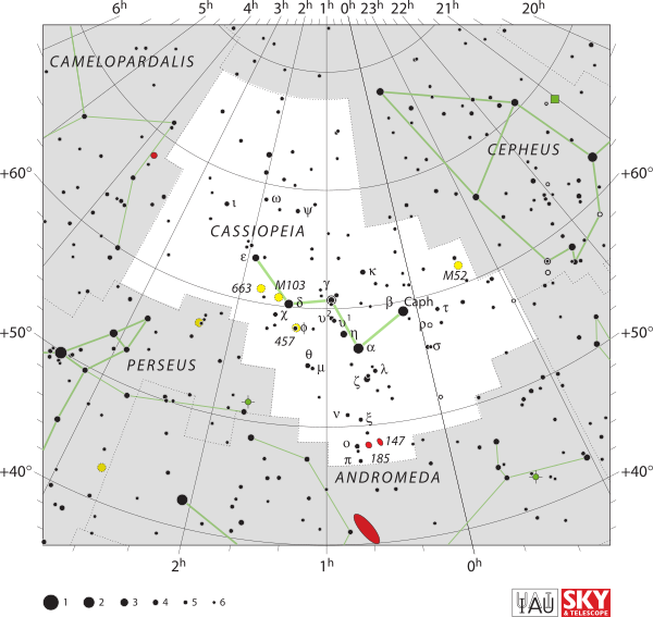 Фи Кассиопеи (φ Cassiopeiae, φ Cas) — спектрально-двойная[4] звезда пятой величины (4m.98) в центре созвездия Кассиопеи, обозначенная двадцать первой буквой греческого алфавита (из двадцати четырёх). Несмотря на свою неяркость, φ Кассиопеи относится к очень редкому классу звёзд, являясь ярким сверхгигантам спектрального класса F (F0), а может быть даже и желтым гипергигантом[1]. Звезда расположена между Рукбахом (дельта Кассиопеи) и двумя Марфаками — локтем — Тета и Мю Кассиопеи. С первого взгляда видно, что звезда лежит прямо на краю рассеянного звёздного скопления NGC 457 (которое также называют «скопление ЕТ» и « скопление Сова»), и давно считается самым ярким его членом (и даже называется NGC 457 NO. 136). Однако, на самом деле это всё не так. Скопление NGC 457 и φ Кассиопеи не связаны друг с другом ни происхождением, ни гравитационно. С одной стороны, относительное движение между φ Кассиопеи и звездами скопления не являются достаточно одинаковым или различным, чтобы прямо утверждать это. Параллактические измерения, с другой стороны, показывают что скопление находится на расстоянии 7900 световых лет, в то время как звезда лежит на расстоянии 2300 световых лет, что делает её объектом переднего плана. Статистическая погрешность измерений, однако, очень высока, и есть вероятность, что звезда находится существенно дальше: на расстоянии 4500 световых лет и, возможно, даже достигает ближайшей границы скопления. Используя данные параллакса и учитывая величину поглощения межзвездной пылью — 1m,7 можно вычислить абсолютную видимую величину для звезды, которая равна −6,0, что явно не достаточно, чтобы быть ярким сверхгигантом (их абсолютная звёздная величина около −8,5). Только если предложить, что звезда находится на том же расстоянии, что и скопление, только тогда можно получить требуемую яркость. Однако на таком большом расстоянии, светимость была бы 215 000 солнечных, масса — 25 солнечных масс, и возраст всего шесть миллионов лет, что сильно отличается от возраста скопления в 20 миллионов лет, так что это предположение, наверняка, неверное. Если же взять верхний предел расстояния в 4500 световых лет, то можно вычислить, что светимость φ Кассиопеи — 70 000 солнечных, радиус — 0,75 астрономической единицы (сопоставимо с расстоянием от Солнца до Венеры), период вращения — 155 дней (с предполагаемой скоростью вращения 27 км/с), масса — 17 солнечных и возраст — 10 миллионов лет (то есть звезда уже умирает и в её центре уже практически сформировалось инертное гелиевое ядро)[1].